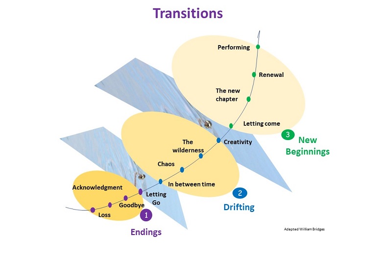 Transition is the inner psychological process that people go through as they internalise and come to terms with the new situation that the change brings about. Empathetic leaders recognise that change can put people in crisis. The starting point for dealing with transition is not the outcome but the endings that people have in leaving the old situation behind.