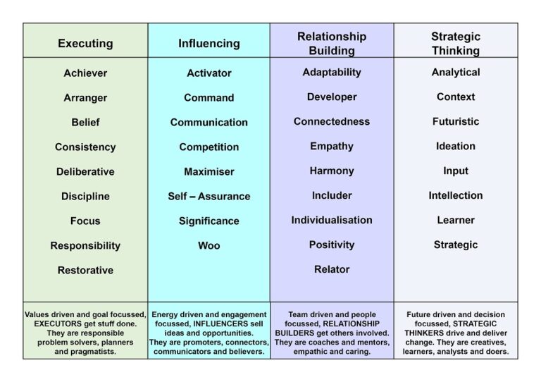 - Executing: People with strengths in this key domain know how to rally around a goal and get things done. Differing strengths might dictate the style of getting to the goal, but people who have strengths in this area make a massive contribution to things happening.
