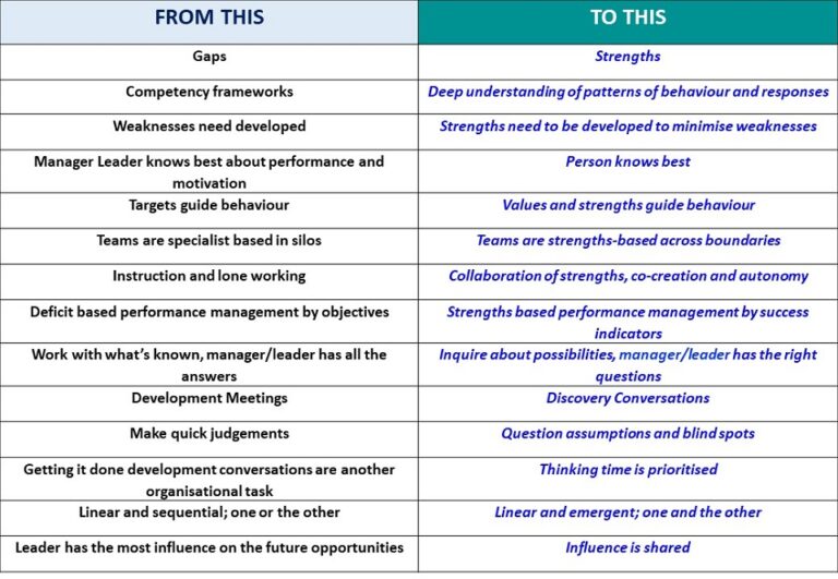 Many leaders and organisations have come to the simple but powerful realisation that to get the most out of people, you must build on their strengths. And yet, though the strengths-based approach is now conventional wisdom, the tools, and systems inside organisations such as performance appraisals, mandatory training, and succession planning systems, remain stubbornly remedial and almost exclusively focused on measuring skills and knowledge, finding gaps, and attempting to plug them. The conversation is not balanced. It’s unusual to be asked, ‘How might you use your strengths to improve your customer relationships?’ and more usual to be told, ‘You need to improve how you engage with customers. I suggest XYZ training and development’.